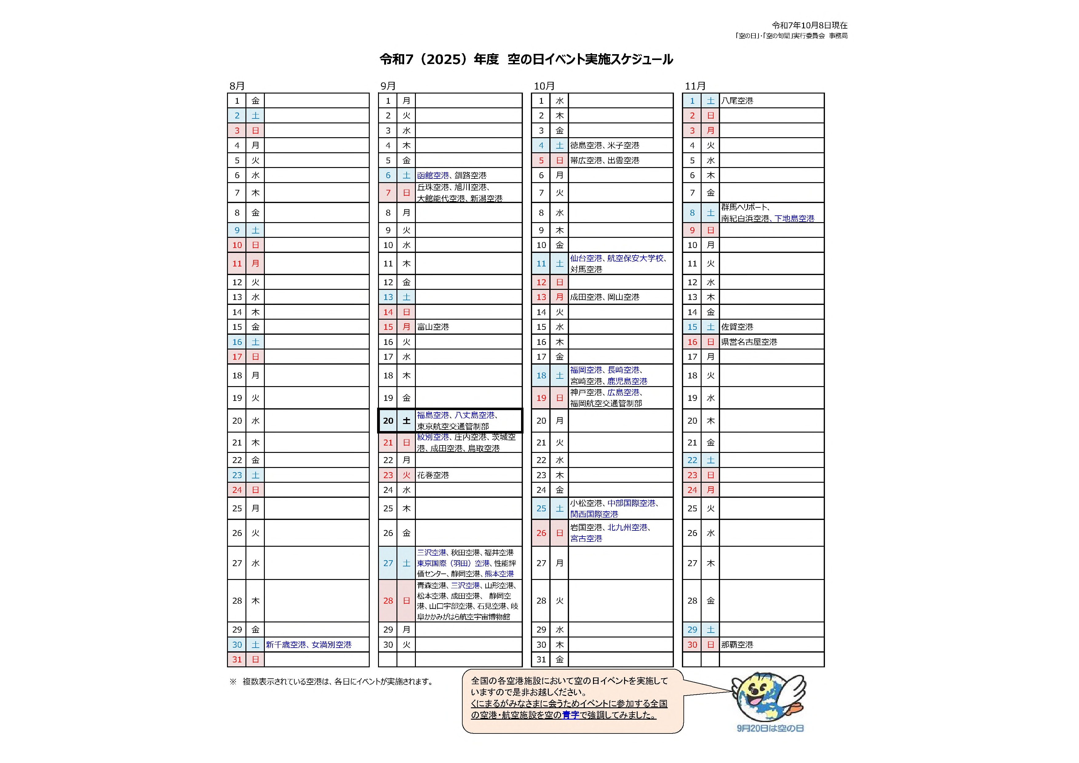 令和7年10月8日現在の「空の日」・「空の旬間」実行委員会事務局において把握し空の日netに掲載しています空の日イベント情報をお伝えいたします。是非、空の日イベント参加の計画にご活用いただけると幸いです。なお、今後も空の日イベント開催状況がわかり次第随時更新してまいります。