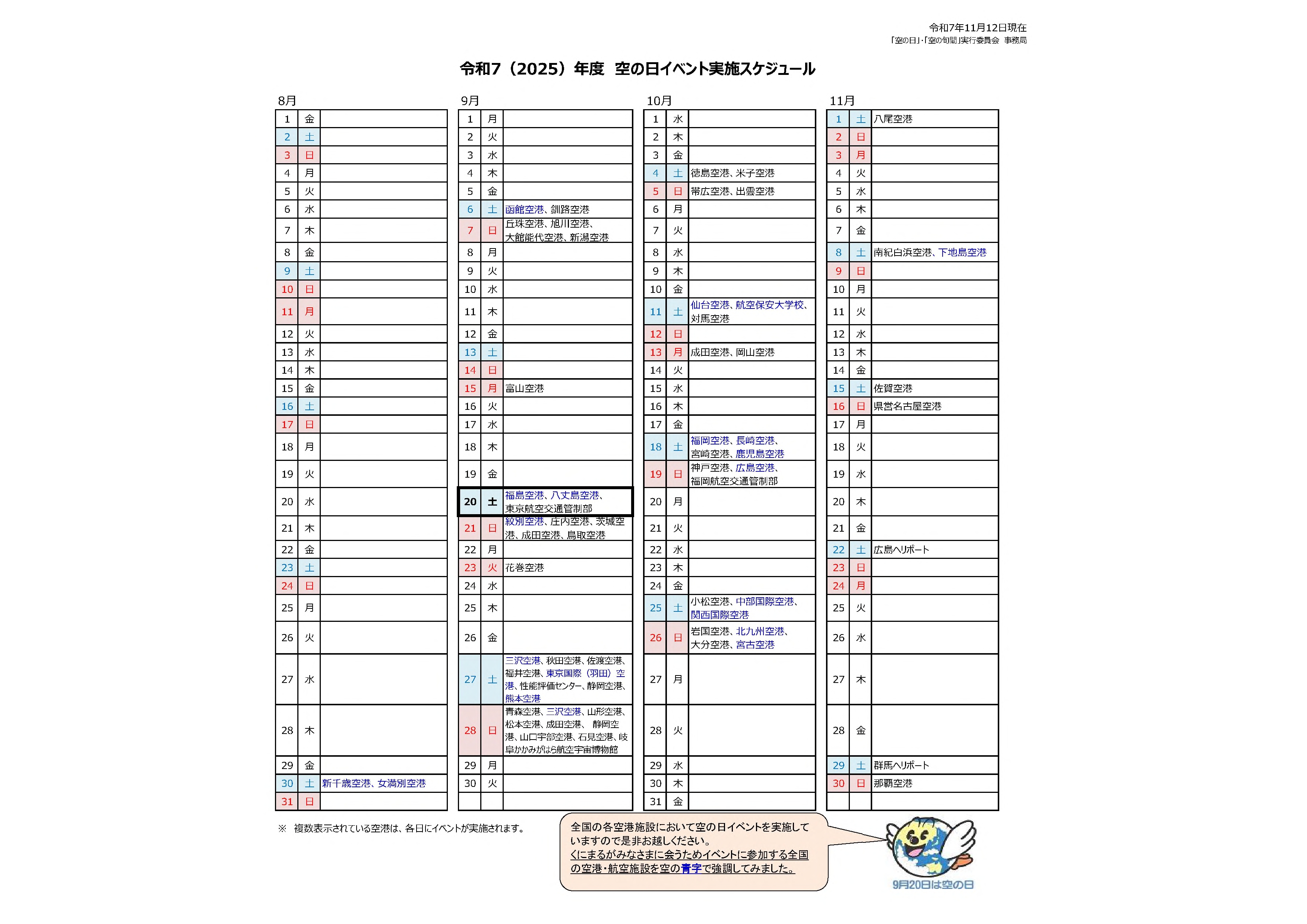 令和7年11月12日現在の「空の日」・「空の旬間」実行委員会事務局において把握し空の日netに掲載しています空の日イベント情報をお伝えいたします。
